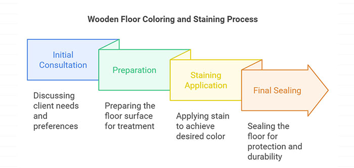 Once the stain color is selected, we move on to the preparation phase. This step is crucial as we thoroughly clean and prepare the surface of the wooden floor. Proper preparation ensures even absorption of the stain, which is essential for achieving a uniform finish.